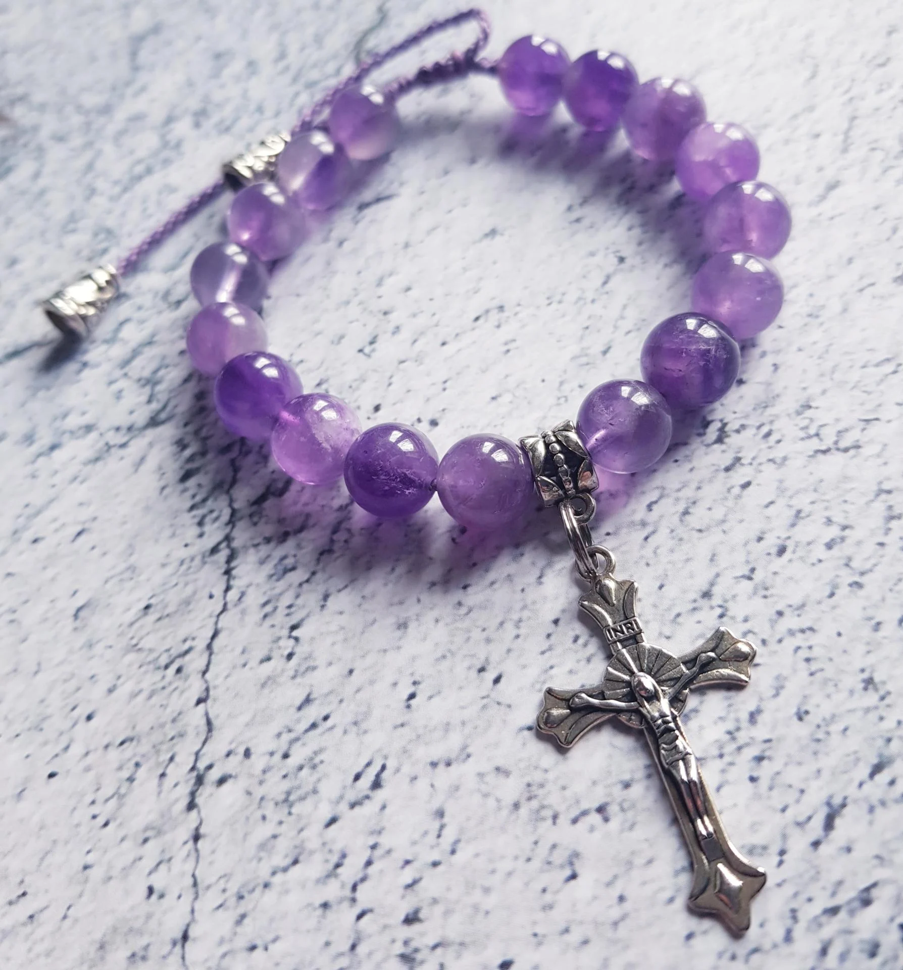 SYSTÈME IMMUNITAIRE - PURIFICATION - SOMMEIL Bracelet "Croix.A" en Pierres Naturelles d'Améthyste de 6.8.10 Mm sur cordon ajustable.Ce magnifique bracelet élaboré en Pierres Naturelles d'Améthyste , un bijou entièrement fait main, de même que toutes les créations proposées par "Christ'Arts".En améthyste de haute qualité afin de vous faire bénéficier de la totalité des vertus et des propriétés énergétiques de cette pierre fabuleuse, sans rien enlever à son éclat ni à sa beauté. Les pierres de ce bracelet en améthyste sont montées sur un cordon ajustable afin de s’adapter au mieux à votre poignet.C'est la Pierre des Hommes d'affaires.Chakra Couronne - Signes Astrologiques de prédilection: Sagittaire - Poissons - Vierge - Capricorne.
