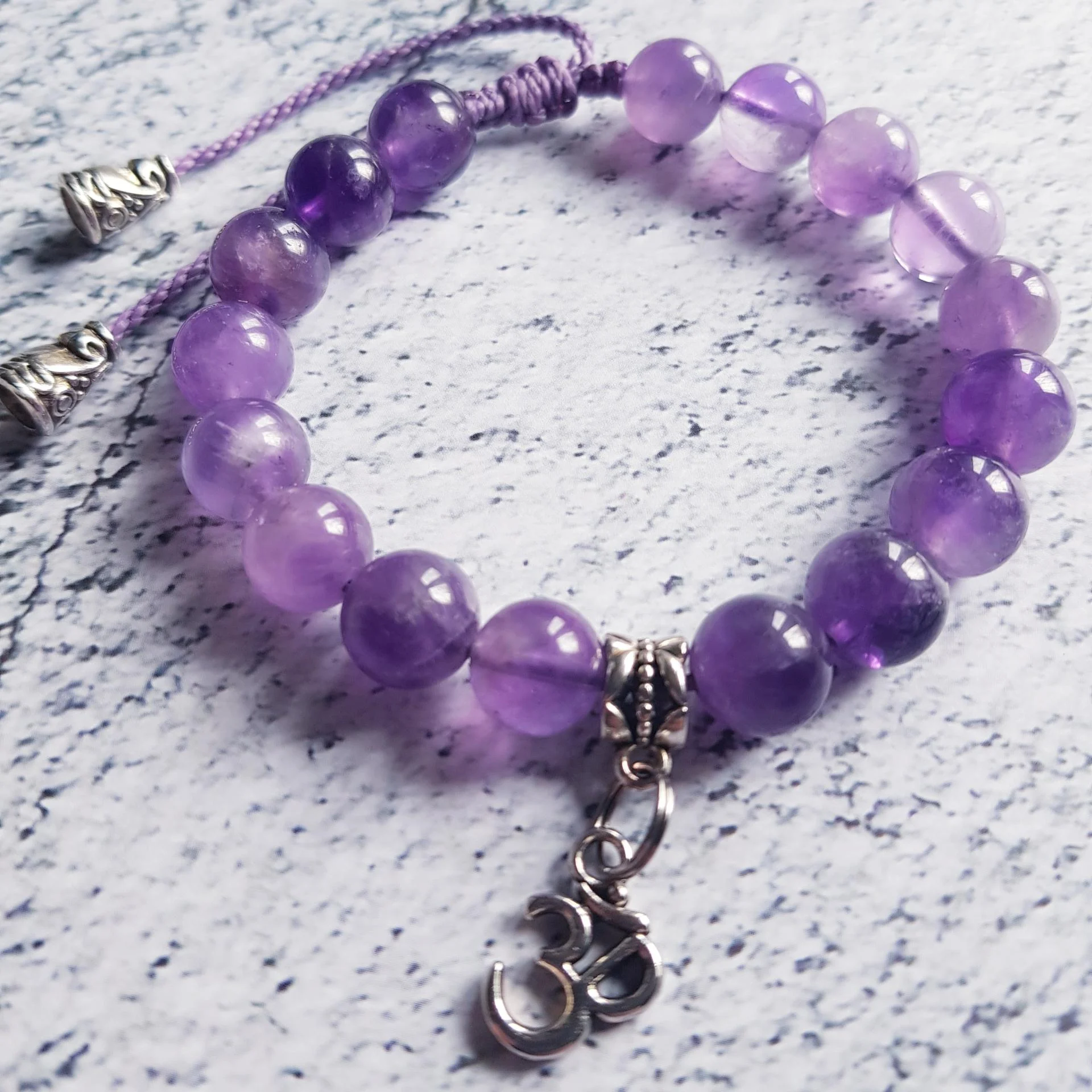 SYSTÈME IMMUNITAIRE - PURIFICATION - SOMMEIL Bracelet "Om.A" en Pierres Naturelles d'Améthyste de 6.8.10 Mm sur cordon ajustable.Ce magnifique bracelet élaboré en Pierres Naturelles d'Améthyste , un bijou entièrement fait main, de même que toutes les créations proposées par "Christ'Arts".En améthyste de haute qualité afin de vous faire bénéficier de la totalité des vertus et des propriétés énergétiques de cette pierre fabuleuse, sans rien enlever à son éclat ni à sa beauté. Les pierres de ce bracelet en améthyste sont montées sur un cordon ajustable afin de s’adapter au mieux à votre poignet.C'est la Pierre des Hommes d'affaires.Chakra Couronne - Signes Astrologiques de prédilection: Sagittaire - Poissons - Vierge - Capricorne.