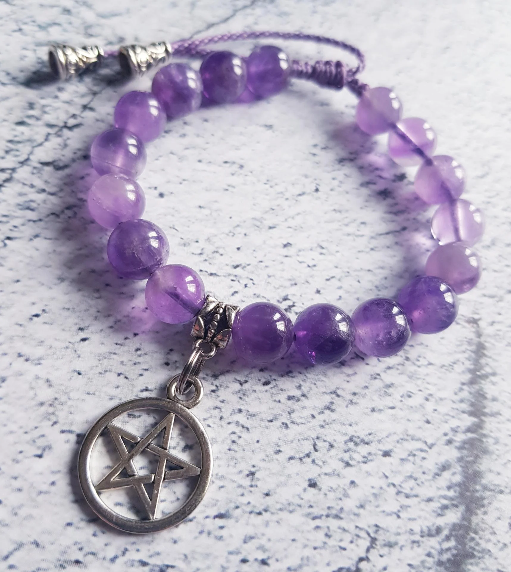 SYSTÈME IMMUNITAIRE - PURIFICATION - SOMMEIL Bracelet "Pentagramme" en Pierres Naturelles d'Améthyste de 6.8.10 Mm sur cordon ajustable.Ce magnifique bracelet élaboré en Pierres Naturelles d'Améthyste , un bijou entièrement fait main, de même que toutes les créations proposées par "Christ'Arts".En améthyste de haute qualité afin de vous faire bénéficier de la totalité des vertus et des propriétés énergétiques de cette pierre fabuleuse, sans rien enlever à son éclat ni à sa beauté. Les pierres de ce bracelet en améthyste sont montées sur un cordon ajustable afin de s’adapter au mieux à votre poignet.C'est la Pierre des Hommes d'affaires.Chakra Couronne - Signes Astrologiques de prédilection: Sagittaire - Poissons - Vierge - Capricorne.