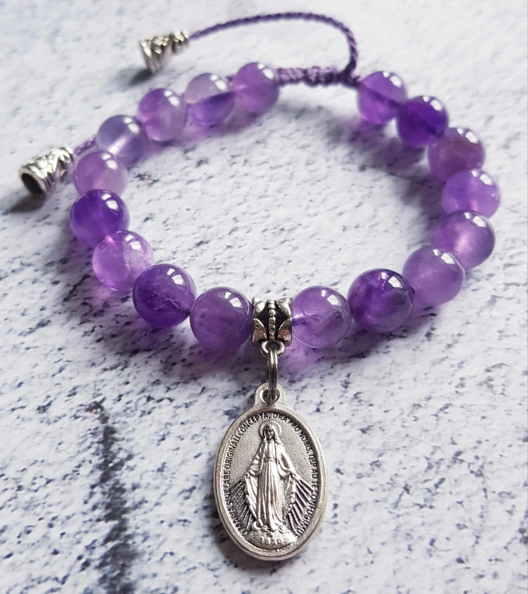 SYSTÈME IMMUNITAIRE - PURIFICATION - SOMMEIL Bracelet "Vierge Marie" en Pierres Naturelles d'Améthyste de 6.8.10 Mm sur cordon ajustable.Ce magnifique bracelet élaboré en Pierres Naturelles d'Améthyste , un bijou entièrement fait main, de même que toutes les créations proposées par "Christ'Arts".En améthyste de haute qualité afin de vous faire bénéficier de la totalité des vertus et des propriétés énergétiques de cette pierre fabuleuse, sans rien enlever à son éclat ni à sa beauté. Les pierres de ce bracelet en améthyste sont montées sur un cordon ajustable afin de s’adapter au mieux à votre poignet.C'est la Pierre des Hommes d'affaires.Chakra Couronne - Signes Astrologiques de prédilection: Sagittaire - Poissons - Vierge - Capricorne.