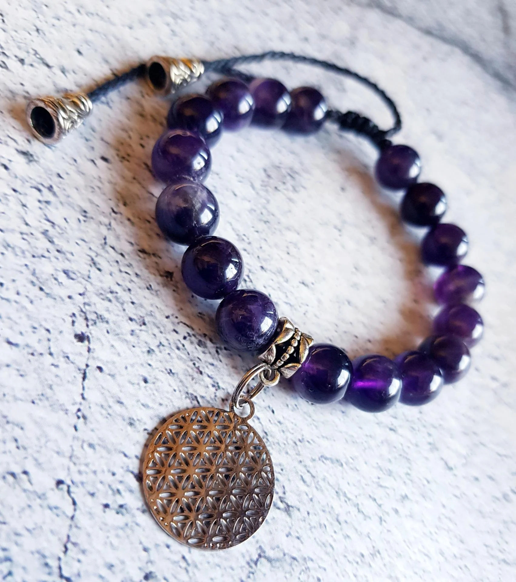 SYSTÈME IMMUNITAIRE - PURIFICATION - SOMMEIL Bracelet "Fleur de Vie" en Pierres Naturelles Black Améthyste de 6.8.10 Mm sur cordon ajustable.Ce magnifique bracelet élaboré en Pierres Naturelles de Black Améthyste , un bijou entièrement fait main, de même que toutes les créations proposées par "Christ'Arts".En Black Améthyste de haute qualité afin de vous faire bénéficier de la totalité des vertus et des propriétés énergétiques de cette pierre fabuleuse, sans rien enlever à son éclat ni à sa beauté. Les pierres de ce bracelet en Brack Améthyste sont montées sur un cordon ajustable afin de s’adapter au mieux à votre poignet.C'est la Pierre des Hommes d'affaires.Chakra Couronne - Signes Astrologiques de prédilection: Sagittaire - Poissons - Vierge - Capricorne.