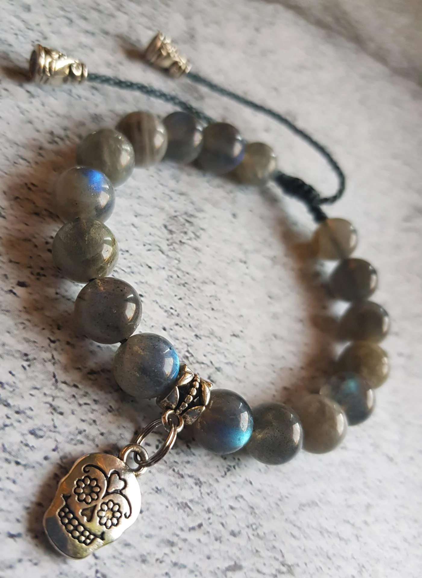 PROTECTION - ÉQUILIBRE ÉNERGÉTIQUE - Bracelet "Calavera" en Pierres Naturelles de Labradorite 6.8.10 Mm sur cordon ajustable.Un bracelet en Pierres Naturelles de labradorite est un bijou élégant qui met en valeur la beauté naturelle de cette pierre semi-précieuse. La labradorite est une pierre qui se caractérise par sa belle couleur bleue ou verte irisée.Il est souple, confortable à porter et ajustable à différents poignets.Chakra du Coeur - Signes Astrologiques de prédilection : Sagittaire - Cancer - Poissons - Gémeaux.