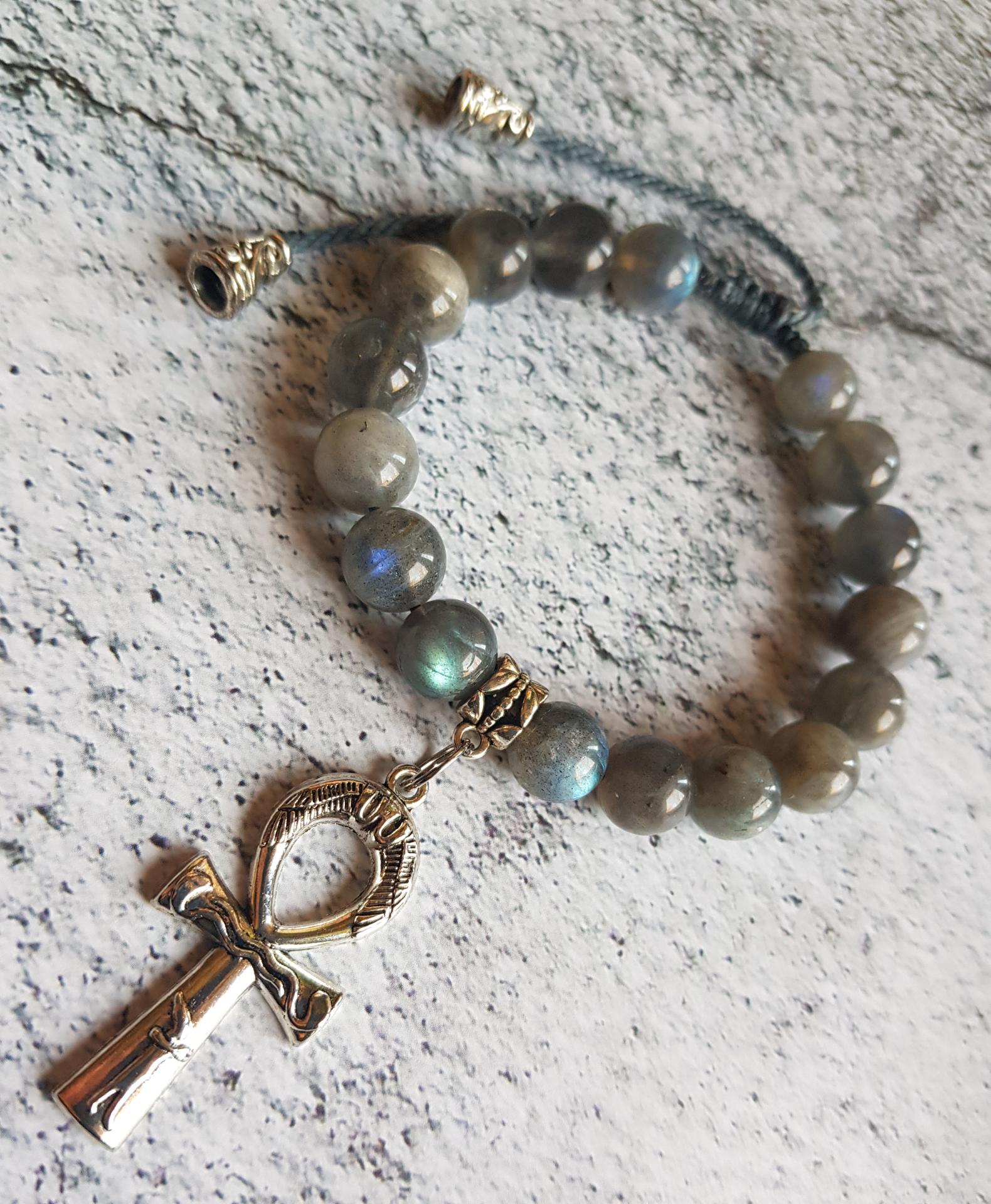 PROTECTION - ÉQUILIBRE ÉNERGÉTIQUE - Bracelet "Ankh.A" en Pierres Naturelles de Labradorite 6.8.10 Mm sur cordon ajustable.Un bracelet en Pierres Naturelles de labradorite est un bijou élégant qui met en valeur la beauté naturelle de cette pierre semi-précieuse. La labradorite est une pierre qui se caractérise par sa belle couleur bleue ou verte irisée.Il est souple, confortable à porter et ajustable à différents poignets.Chakra du Coeur - Signes Astrologiques de prédilection : Sagittaire - Cancer - Poissons - Gémeaux.