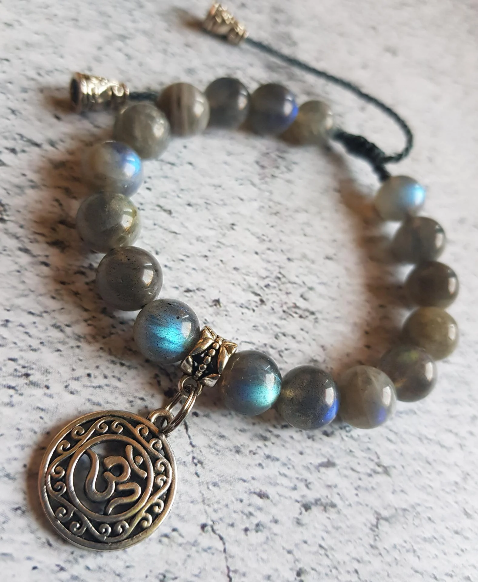 PROTECTION - ÉQUILIBRE ÉNERGÉTIQUE - Bracelet "Om.B" en Pierres Naturelles de Labradorite 6.8.10 Mm sur cordon ajustable.Un bracelet en Pierres Naturelles de labradorite est un bijou élégant qui met en valeur la beauté naturelle de cette pierre semi-précieuse. La labradorite est une pierre qui se caractérise par sa belle couleur bleue ou verte irisée.Il est souple, confortable à porter et ajustable à différents poignets.Chakra du Coeur - Signes Astrologiques de prédilection : Sagittaire - Cancer - Poissons - Gémeaux.