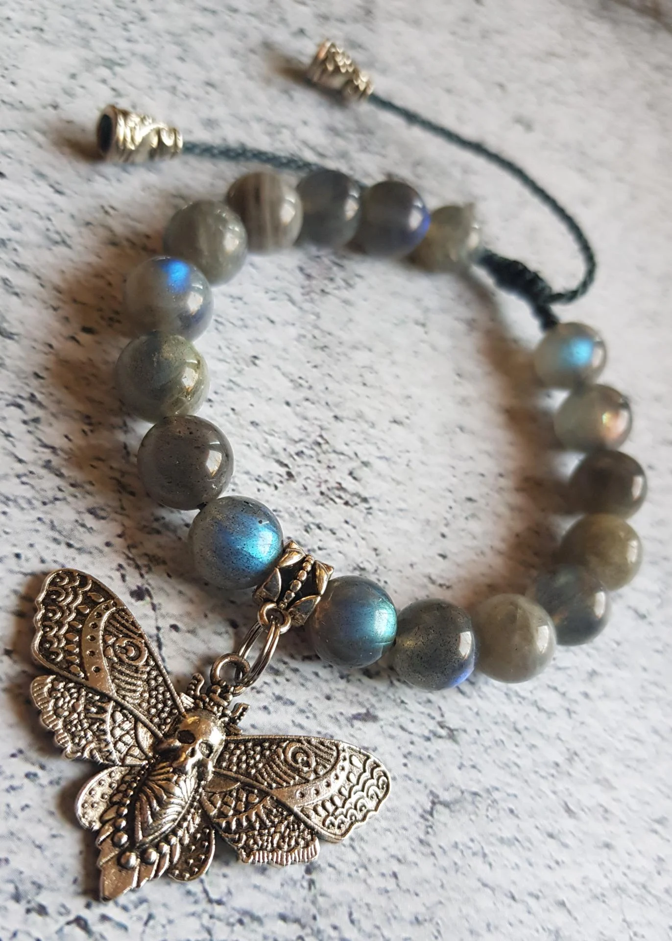 PROTECTION - ÉQUILIBRE ÉNERGÉTIQUE - Bracelet "Papillon Skull.A" en Pierres Naturelles de Labradorite 6.8.10 Mm sur cordon ajustable.Un bracelet en Pierres Naturelles de labradorite est un bijou élégant qui met en valeur la beauté naturelle de cette pierre semi-précieuse. La labradorite est une pierre qui se caractérise par sa belle couleur bleue ou verte irisée.Il est souple, confortable à porter et ajustable à différents poignets.Chakra du Coeur - Signes Astrologiques de prédilection : Sagittaire - Cancer - Poissons - Gémeaux.